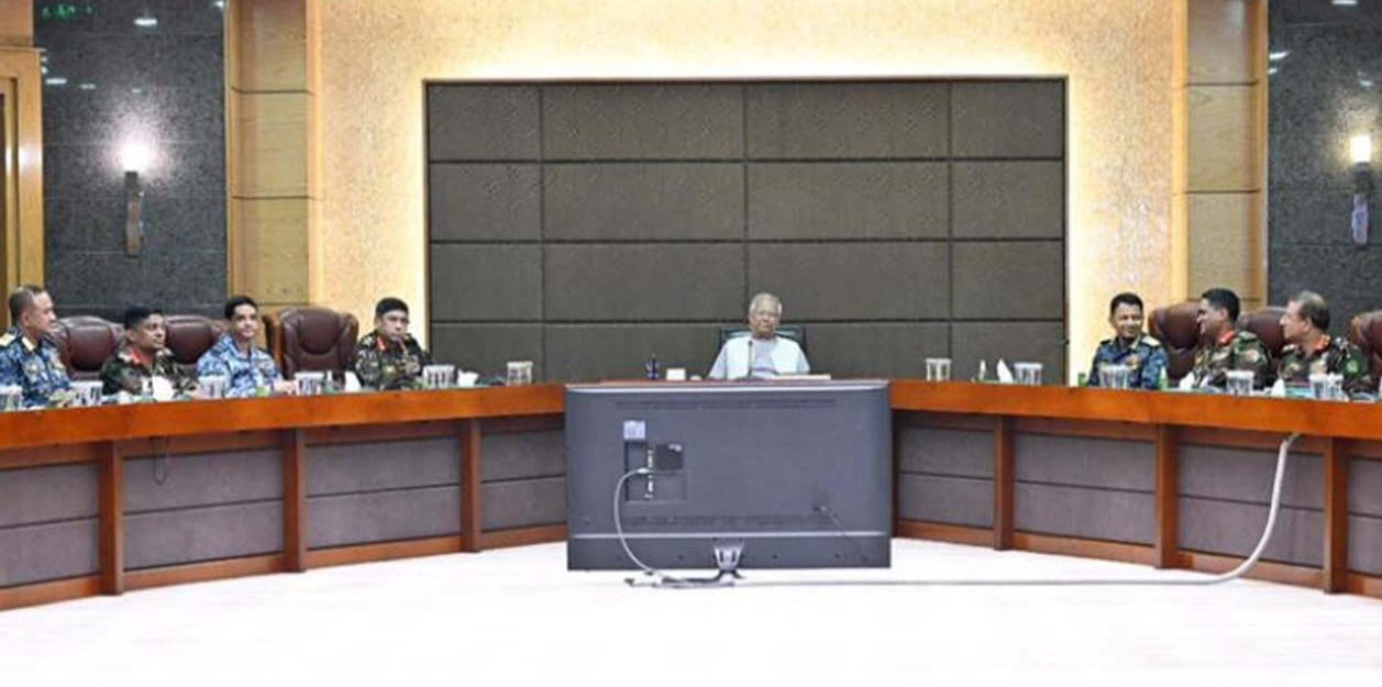 সেনাসদরের হেলমেট অডিটোরিয়ামে সশস্ত্র বাহিনীর ঊর্ধ্বতন কর্মকর্তাদের মতবিনিময় সভার অনুষ্ঠানস্থলে পৌঁছালে প্রধান উপদেষ্টাকে সেনাবাহিনী প্রধান জেনারেল ওয়াকার-উজ-জামান, নৌবাহিনী প্রধান অ্যাডমিরাল এম নাজমুল হাসান, বিমান বাহিনী প্রধান এয়ার চিফ মার্শাল হাসান মাহমুদ খাঁন এবং সশস্ত্র বাহিনী বিভাগের প্রিন্সিপাল স্টাফ অফিসার লে. জেনারেল এস এম কামরুল হাসান অভ্যর্থনা জানান।