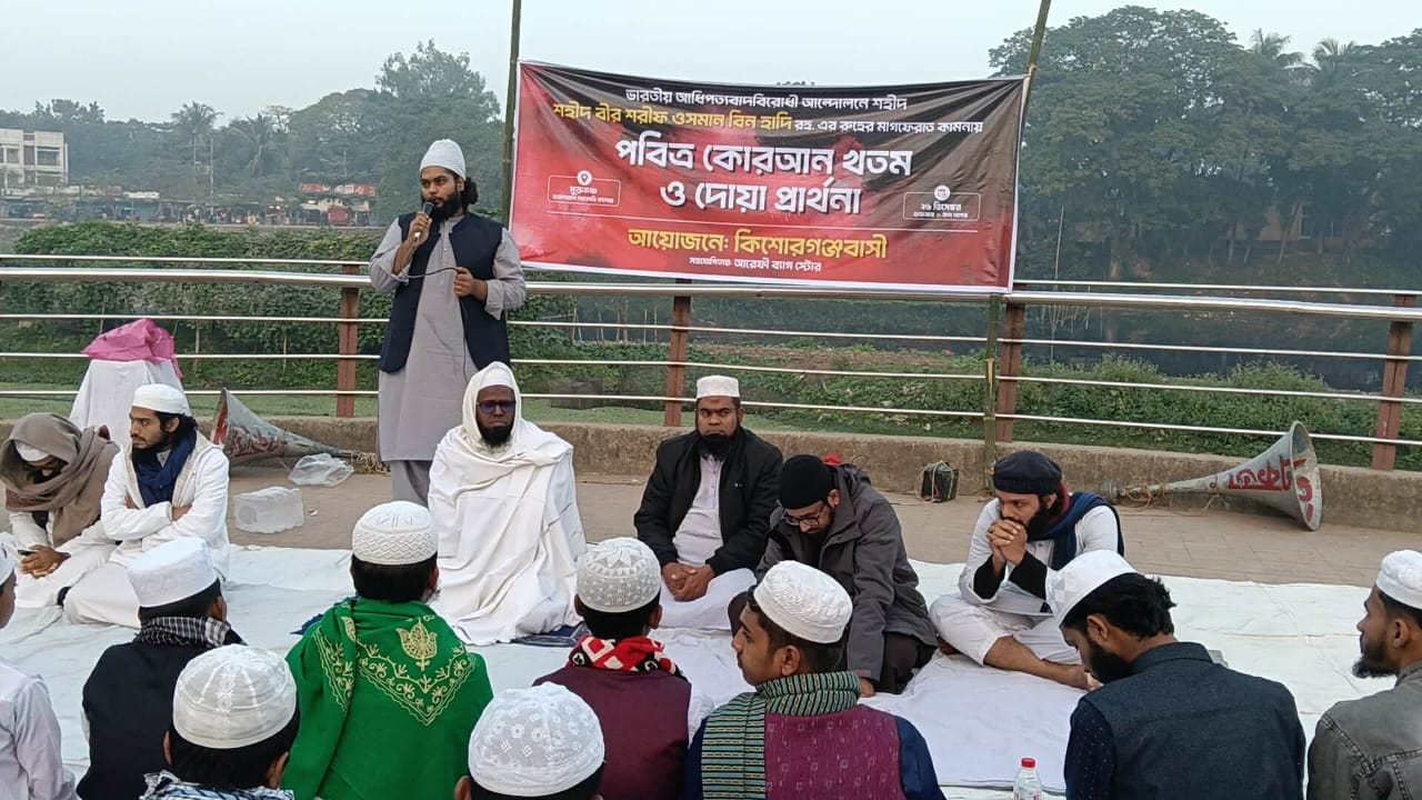 ভারতীয় আধিপত্যবাদবিরোধী আন্দোলনে শহিদ বীর শরীফ ওসমান হাদী (রহ.)-এর রূহের মাগফেরাত কামনায় কিশোরগঞ্জে পবিত্র কোরআন খতম ও দোয়া মাহফিল অনুষ্ঠিত হয়েছে।