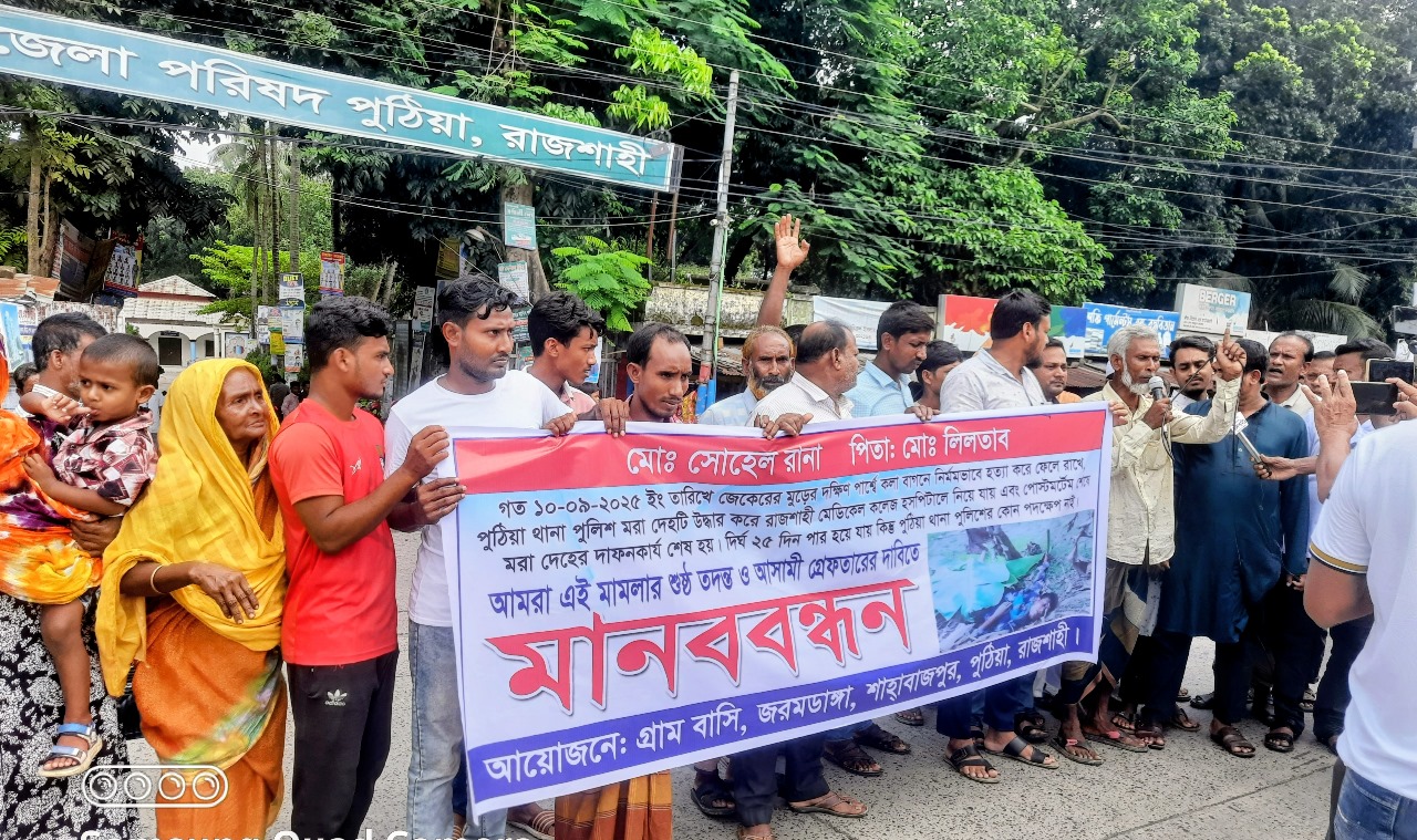 জানা গেছে, মানববন্ধনে পুঠিয়া থানাধীন জরমডাঙ্গা, কান্দ্রা ও শাহাবাজপুর এলাকার কয়েকশ’ বিভিন্ন শ্রেণি-পেশার মানুষ অংশ নেন। তারা মহাসড়ক অবরোধ করে প্রায় ২৫ মিনিট অবস্থান নেয়। ফলে যান চলাচল সাময়িকভাবে বন্ধ থাকে। মানববন্ধনে নিহত সোহেলের পিতা নিল্লাতাব আলী, মাহফুজুর রহমান বাবলু, হাফেজ আঃ রহমান, হাফেজ আশরাফুল ইসলাম প্রমুখ বক্তব্য রাখেন।