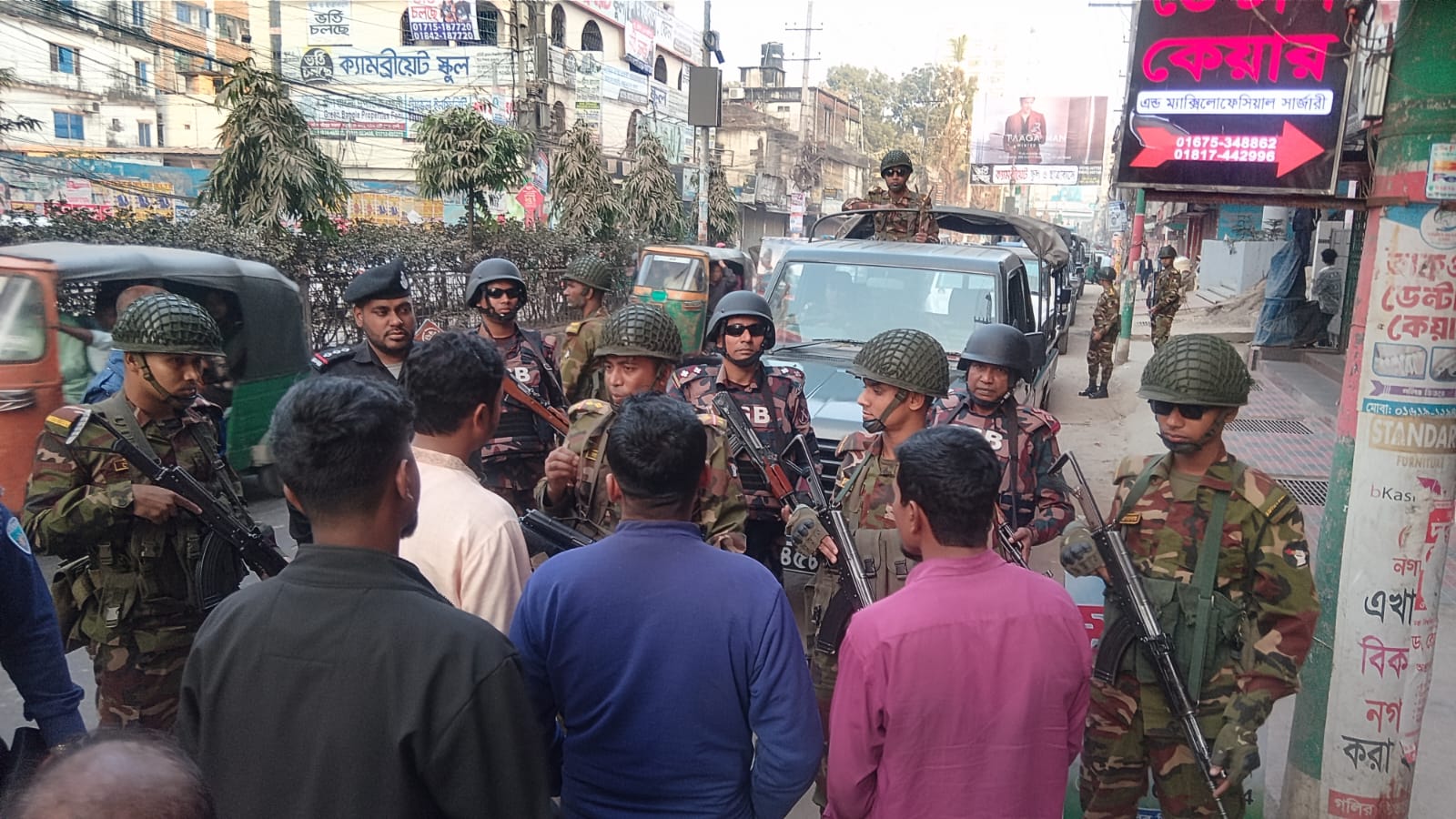 আজ ২৩ জানুয়ারি ২০২৬ খ্রিস্টাব্দ বিকাল ৩টা থেকে সন্ধ্যা ৫ টা পর্যন্ত আসন্ন ত্রয়োদশ জাতীয় সংসদ নির্বাচন ও গণভোটকে কেন্দ্র করে ফেনী শহর এলাকার আইন-শৃঙ্খলা পরিস্থিতি স্বাভাবিক ও নিরাপদ রাখার লক্ষ্যে সেনাবাহিনী ও বিজিবিসহ অন্যান্য আইন-শৃঙ্খলা বাহিনীর সমন্বয়ে একটি সমন্বিত টহল ও মহড়া কার্যক্রম পরিচালনা করা হয়।