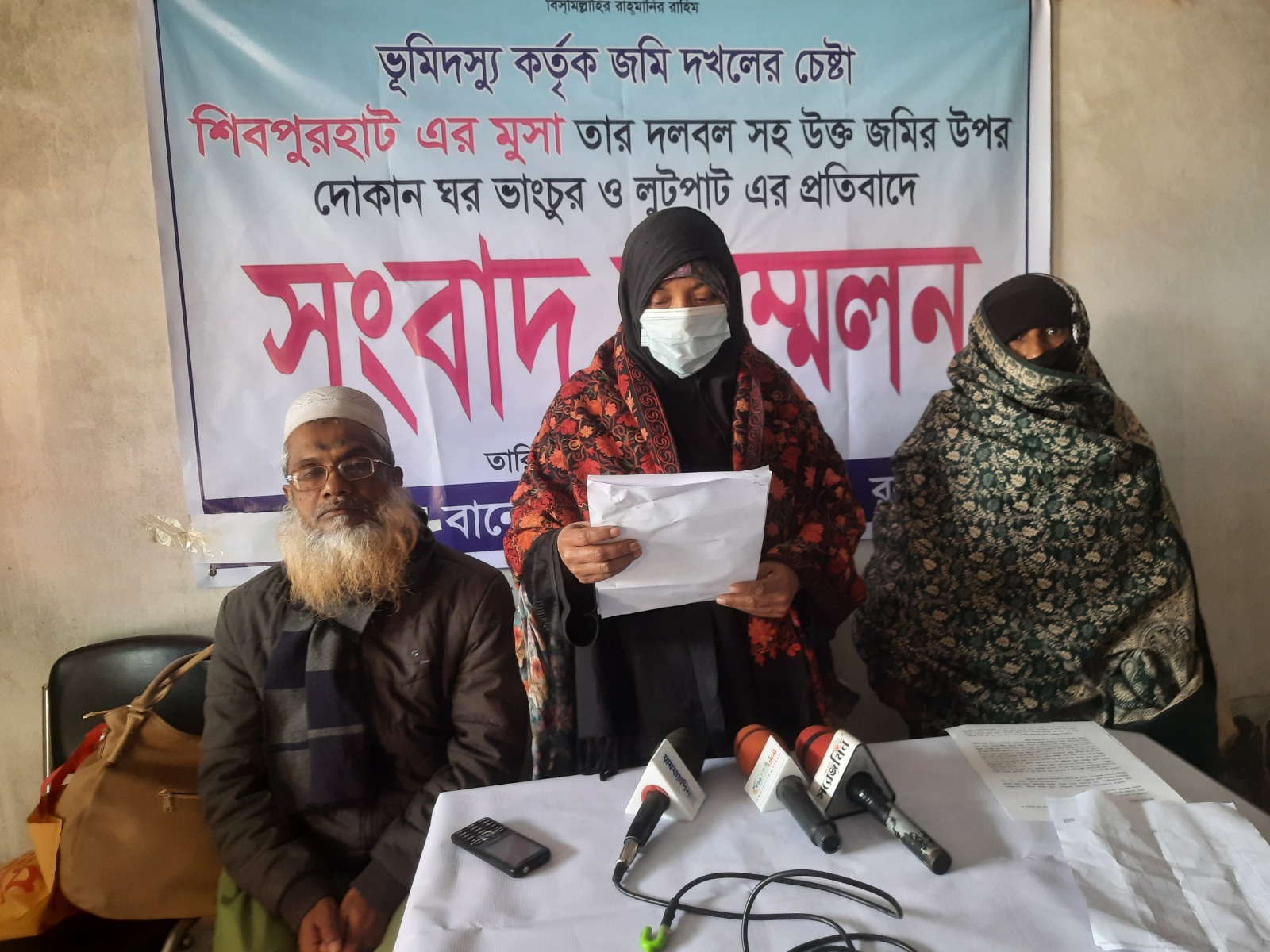 ভুক্তভোগীরা জানান, শিবপুর হাটের জে.এল নং–২৩-এর আওতাধীন আরএস খতিয়ান নং ১১৯, দাগ নং ১২২ ও ১৩৫ এর মোট ০.৩০৪১ একর ইয়াকুব আলী, ইউনুছ আলী ও ইয়াহিয়া নামে তিন ভাইয়ের নামে রেকর্ডভুক্ত ছিল। পরবর্তীতে ইয়াকুব ও ইয়াহিয়া তাদের অংশ বিক্রি করলে ইউনুছ আলী ০.০২৭৫ একর জমি ক্রয় করে নিজের মালিকানায় নেন। এছাড়া, আরএস দাগ নং ১৩৫ এর ০.২৪ একর জমির একক মালিক ছিলেন ইউনুছ আলী। তিনি মৃত্যুবরণ করলে উক্ত ০.৩০৪১ একর জমি তার ওয়ারিশগণের নামে আসে। যা বর্তমানে তার ওয়ারিশদের দখলে রয়েছে। বহু বছর ধরে তারা উক্ত জমি শান্তিপূর্ণভাবে ভোগদখল করে আসছেন এবং সেখানে দোকানঘর নির্মাণ করে ব্যবসা পরিচালনা করছেন।