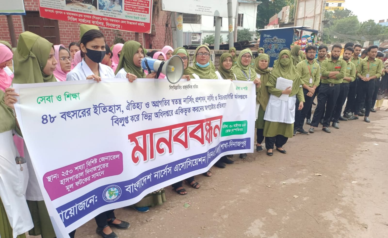অপরদিকে, একই দাবিতে একই সময়ে সিভিল সার্জন কার্যালয়ের সামনে ২৫০ শয্যাবিশিষ্ট দিনাজপুর জেনারেল হাসপাতালের নার্সিং কর্মকর্তা ও দিনাজপুর নার্সিং কলেজের শিক্ষক-শিক্ষার্থীরা মানবন্ধন কর্মসূচি পালন করেছে।
